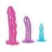 Strap-on beginners should start with the Blue Rippled Dildo. Measuring just 3.5 inches long, this non-threating toy features a tapered tip for easy penetration with a ribbed shaft for extra stimulation. More experienced users can try the 5-inch-long Purple Curved Tip Dildo for G-Spot and prostate thrills. Or you can jump in the deep end with the 7-inch-long Pink Realistic Dildo with a lifelike penis-shaped tip and bumpy shaft for stimulating thrusts. All 3 dildos have suction-cup bases for hands-free fun without a harness.