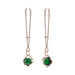 A touch of tease, a hint of pressure, and a whole lot of glam. The Indica Nipple Clips feature adjustable tension and soft rubber tips for comfort and control. A dangling green gem and gold hardware add a luxurious flair, making these perfect for visual and physical stimulation. Whether you're dressing up for a scene or exploring sensation play for the first time, these clips deliver pleasure with style.